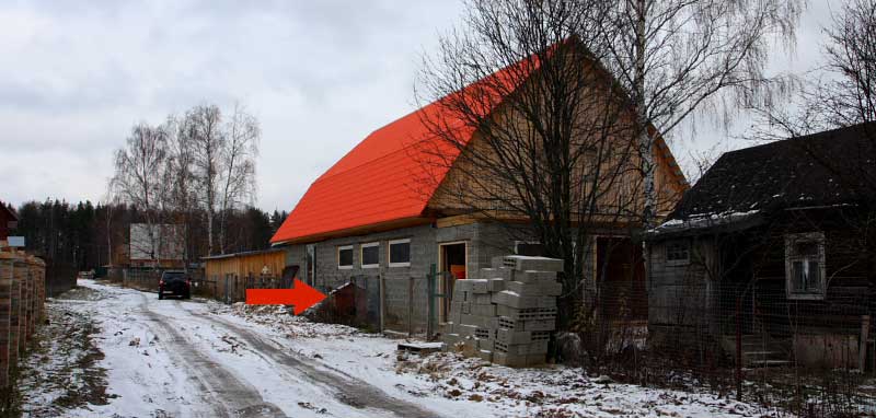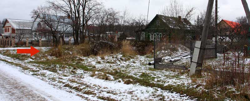 После церкви едем почти до конца деревни (метров 800) и видим справа прудик пожарный и оранжевую крышу.